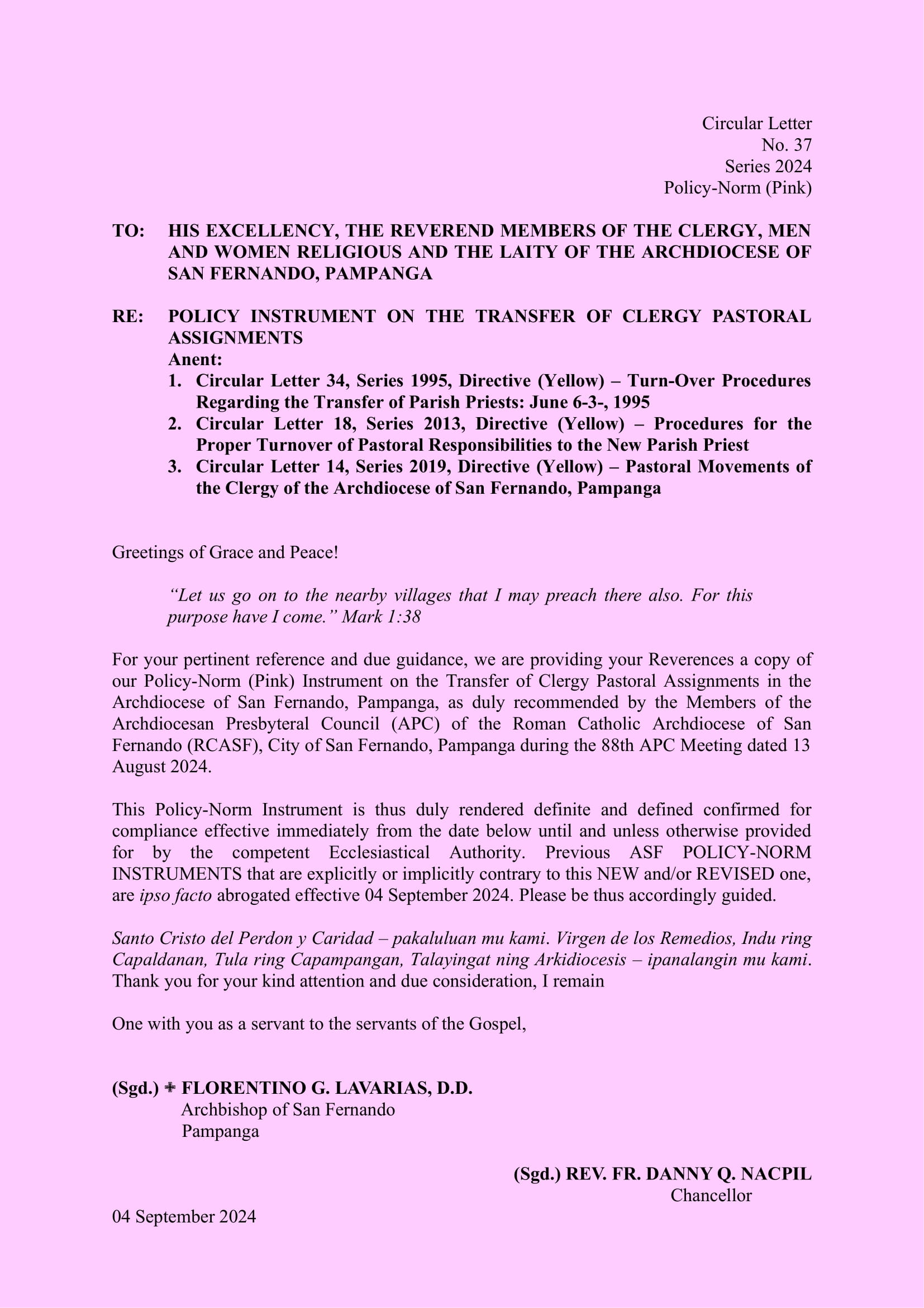 • 2024 CL 37 – Policy -Transfer of Clergy Pastoral Assignments
