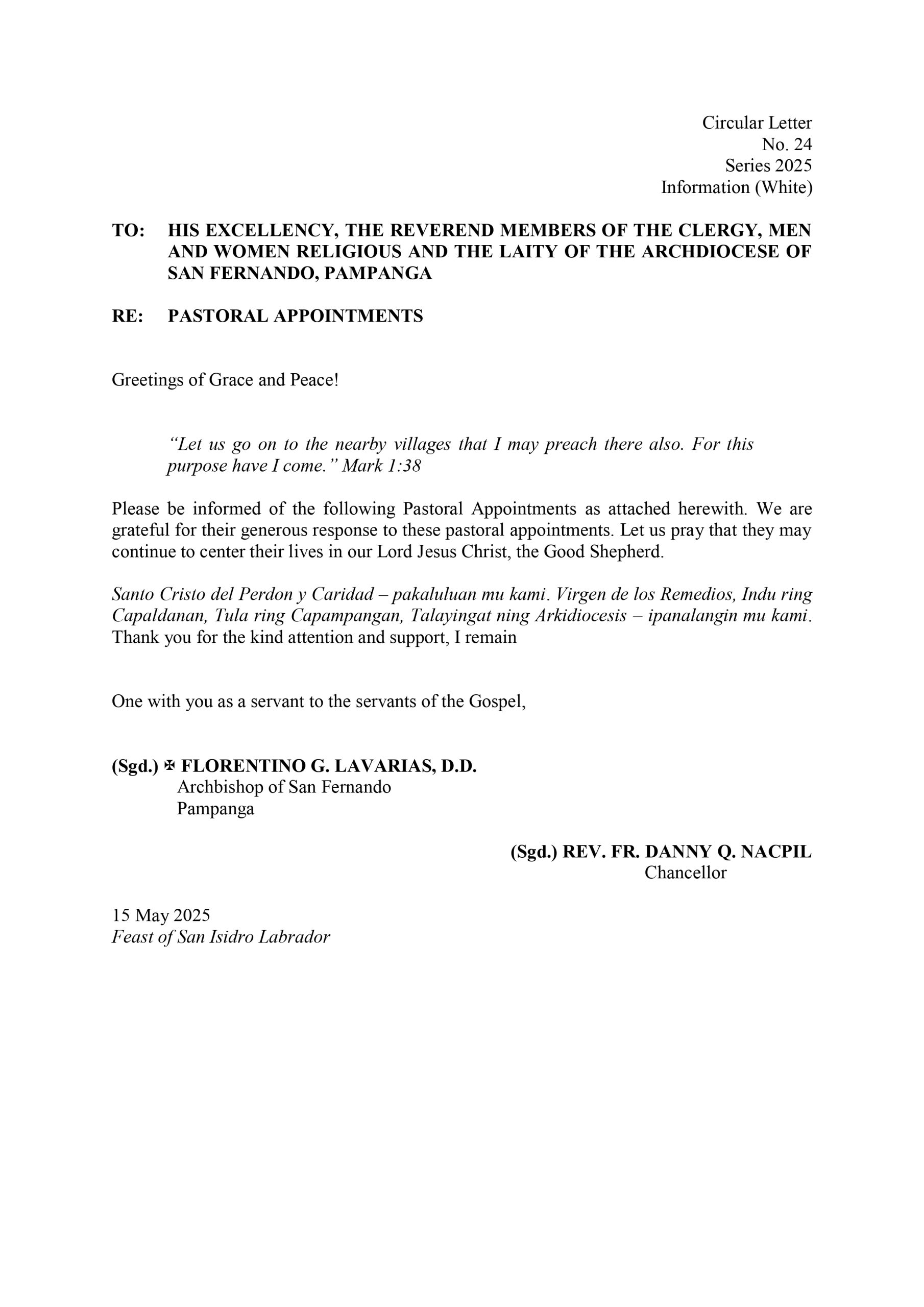 2025 CL 24 – Pastoral Appointments May 15, 2025 by rcasf Leave a Comment 2025 CL 24 – Pastoral Appointments Download Here