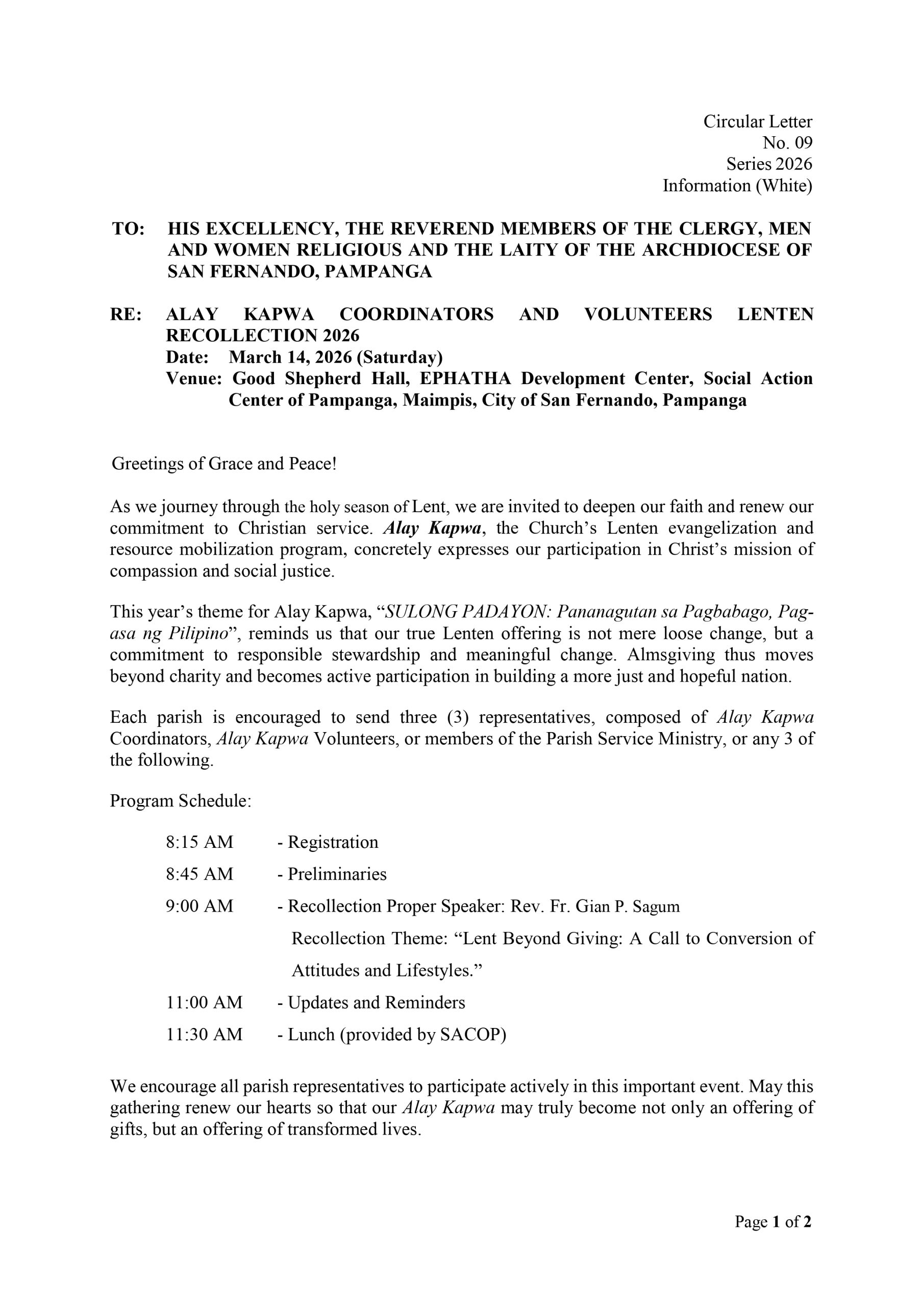 2026 CL 09 – Alay Kapwa Coordinators & Volunteers Lenten Recollection February 24, 2026 by rcasf Leave a Comment 2026 CL 09 – Alay Kapwa Coordinators & Volunteers Lenten Recollection Download Here