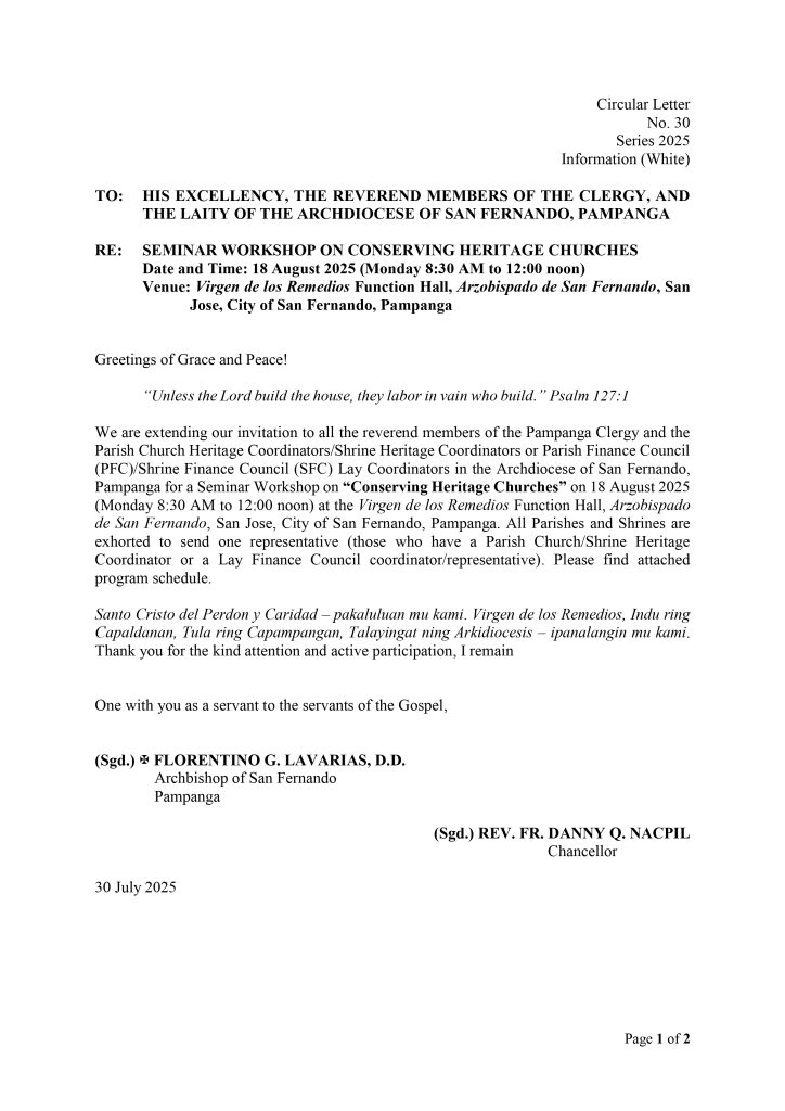 1. The images of the Virgen de los Remedios and the Santo Cristo del Perdon y Caridad will be transferred from the VDLR Repository Chapel, San Jose, CSFP, to the Metropolitan Cathedral of San Fernando, CSFP, on 29 August 2025 (Friday, 2:30 PM).