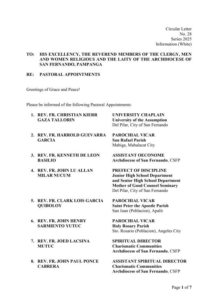 He has been appointed as the Parochial Vicar of the San Rafael Parish, located in Mabiga, Mabalacat, Pampanga.