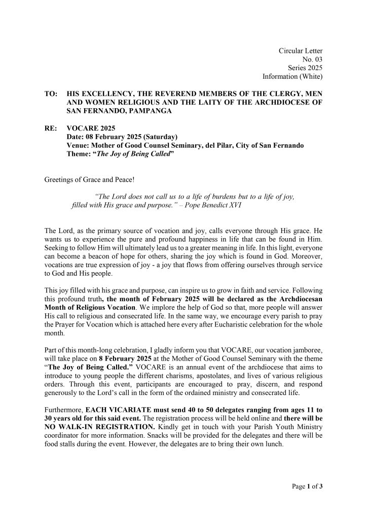 We shall convene 4:00 pm at the Mother of Good Counsel Seminary Chapel for the opening rites of the mass. Subsequently, we will embark on a pilgrimage procession to the Metropolitan Cathedral of San Fernando.