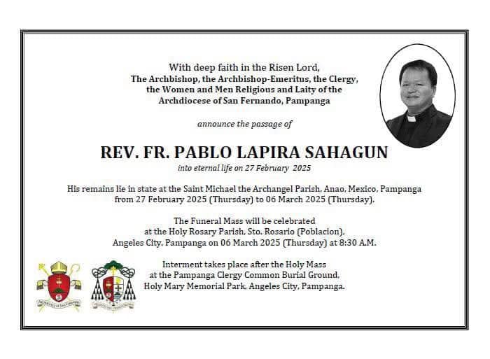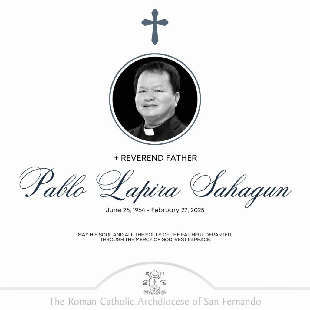 Trusting in the Lord’s promise of eternal life, the Archdiocese of San Fernando announces the passing of REVEREND FATHER PABLO LAPIRA SAHAGUN today, 27th of February 2025.