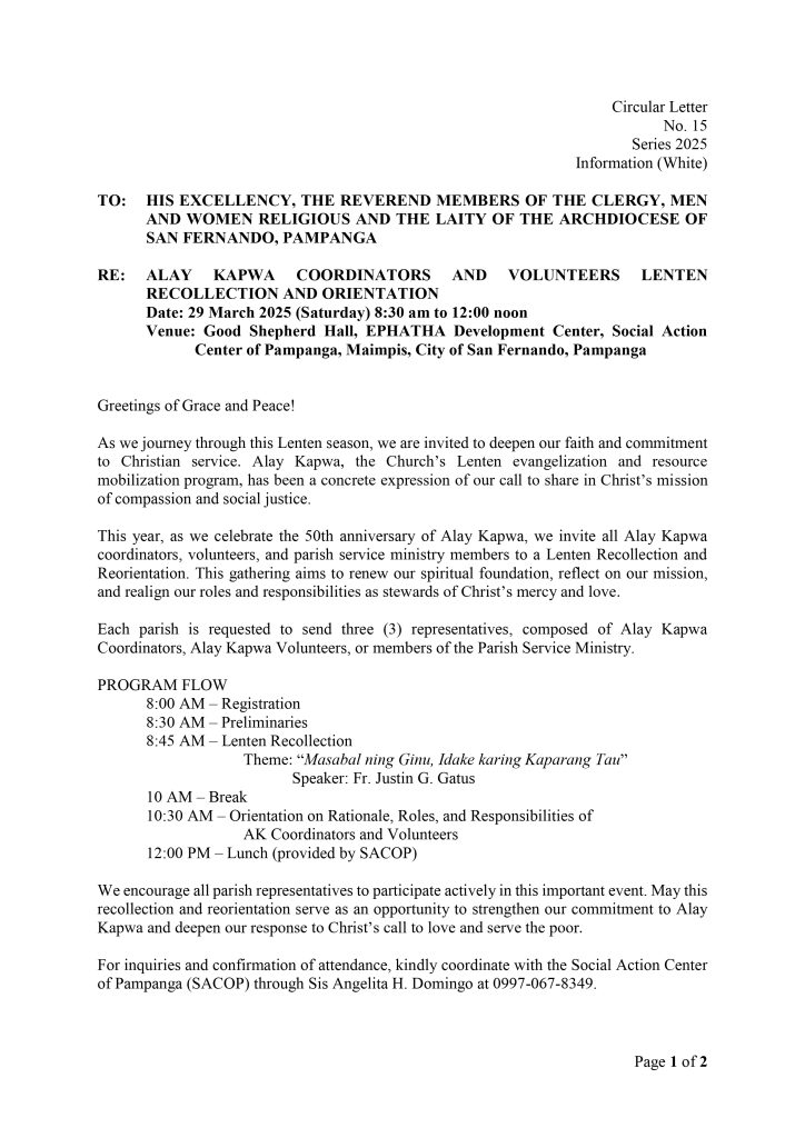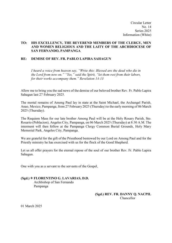 Trusting in the Lord’s promise of eternal life, the Archdiocese of San Fernando announces the passing of REVEREND FATHER PABLO LAPIRA SAHAGUN today, 27th of February 2025.