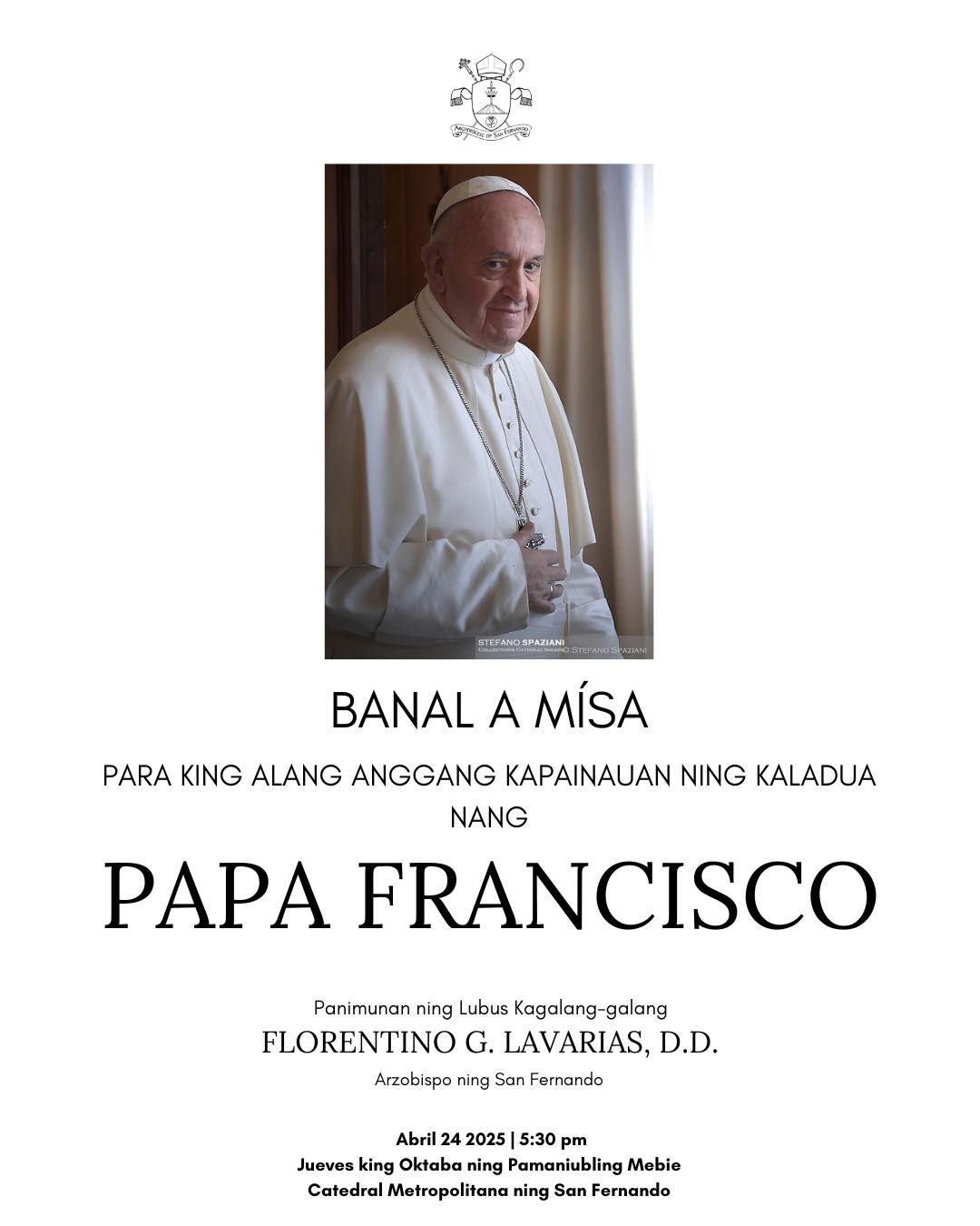 Let us be one in offering a Requiem Mass for our late Holy Father, Pope Francis at the Metropolitan Cathedral of San Fernando, Santo Rosario (Poblacion), City of San Fernando on 24 April 2025 (Thursday) at 5:30 P.M.