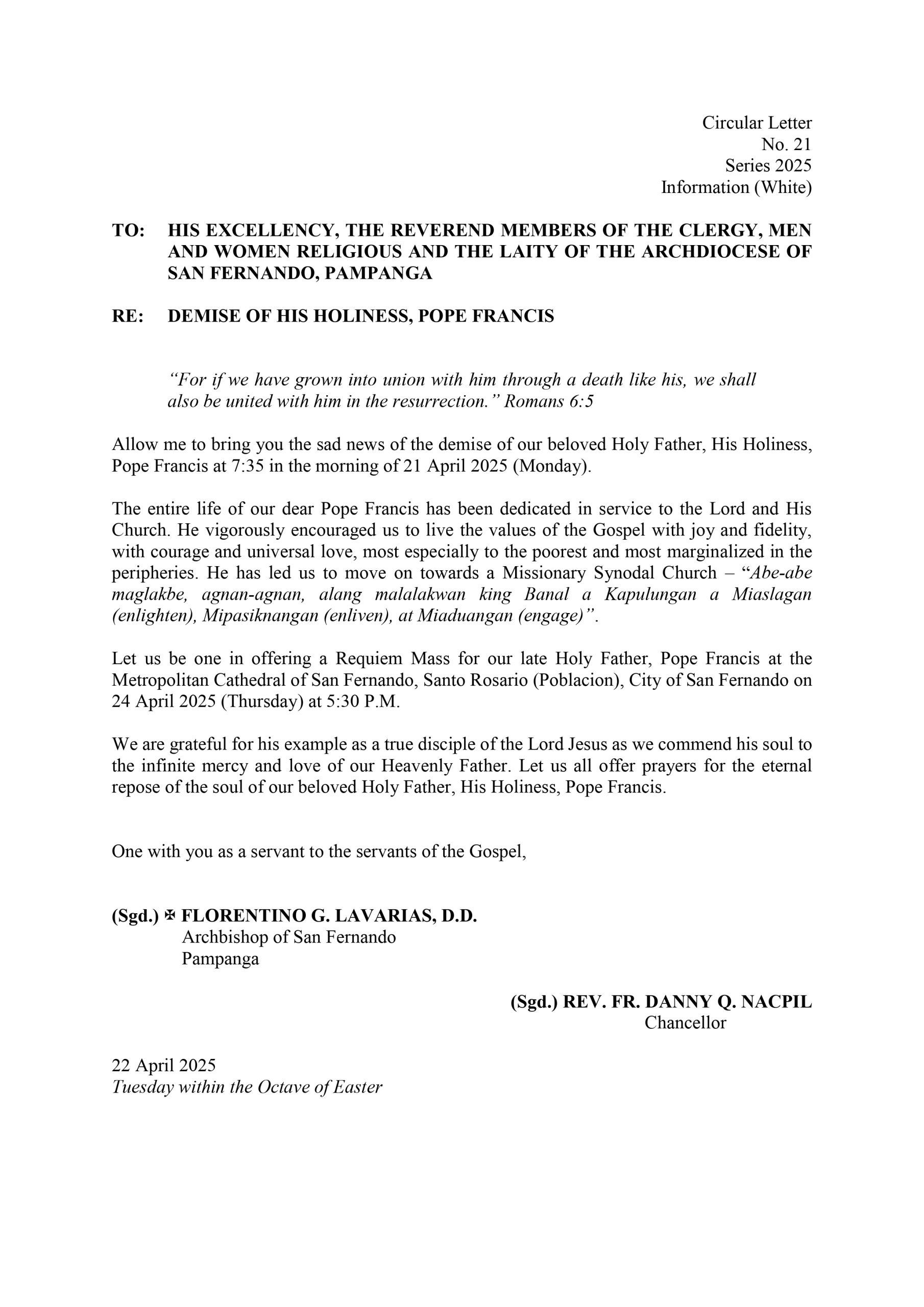 2025 CL 21 – Demise of His Holiness, Pope Francis 2025 CL 21 – Demise of His Holiness, Pope Francis Download Here