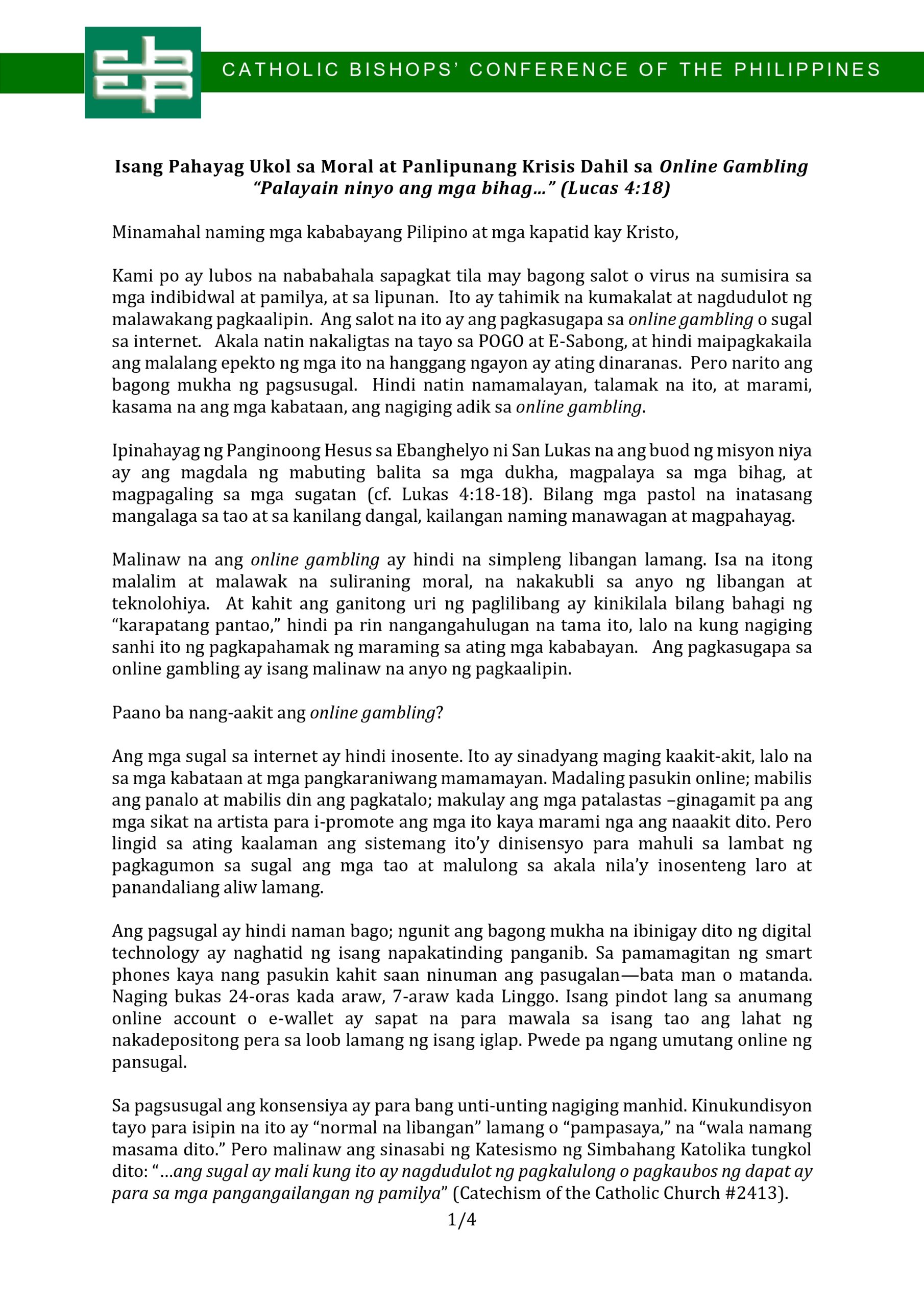2025 CL 31 – CBCP Pastoral Letter on Online Gambling 2025 CL 31 – CBCP Pastoral Letter on Online Gambling Download Here